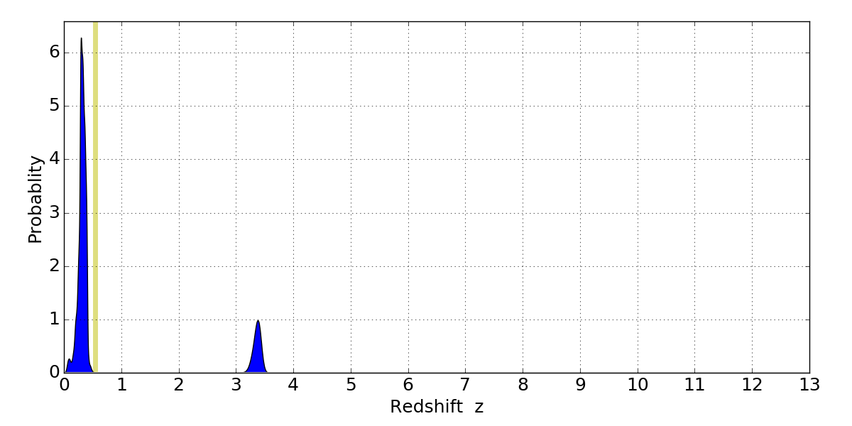 In P(z) plots: Yellow lines mark the cluster redshift z = 0.540,