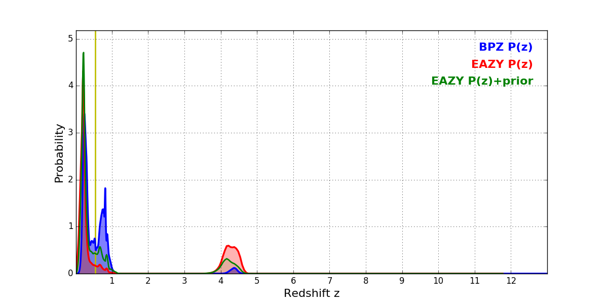 In P(z) plots: Yellow lines mark the cluster redshift z = 0.540,