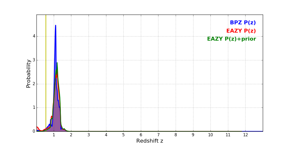 In P(z) plots: Yellow lines mark the cluster redshift z = 0.540,