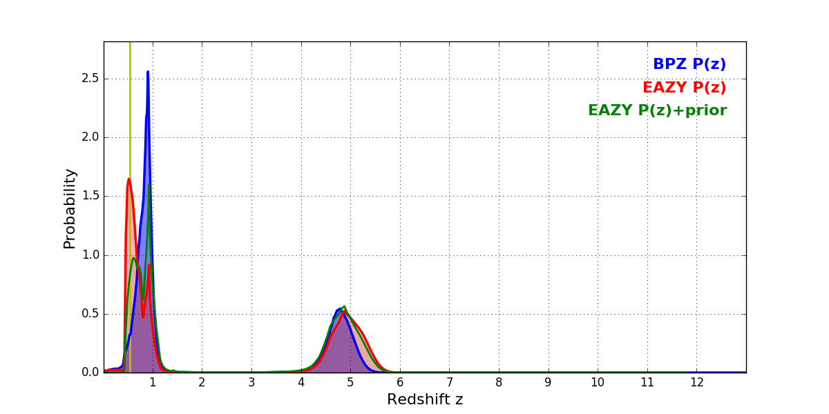 In P(z) plots: Yellow lines mark the cluster redshift z = 0.540,