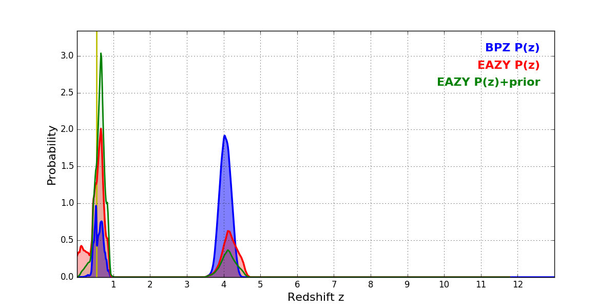 In P(z) plots: Yellow lines mark the cluster redshift z = 0.540,