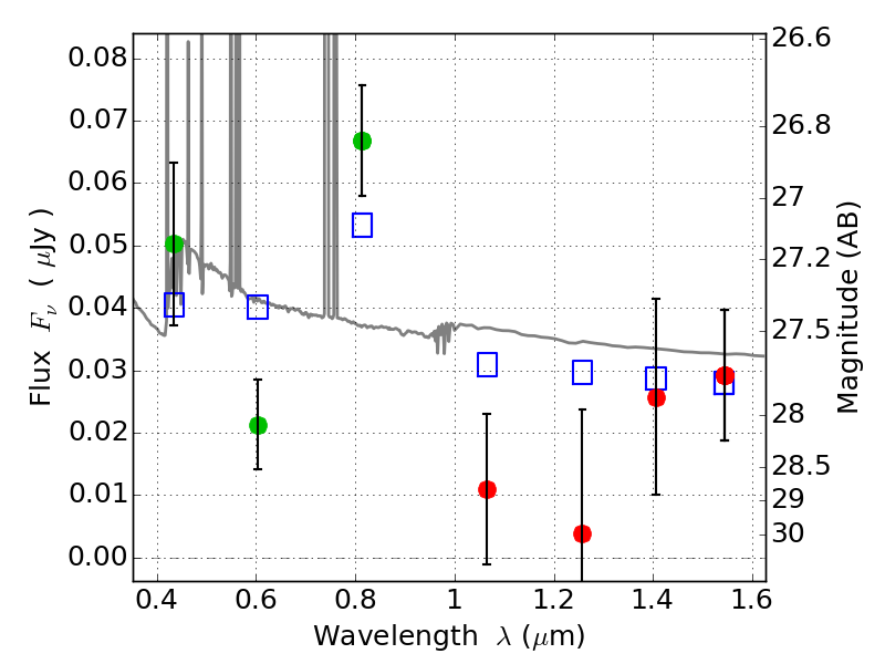 Object #2692 x,y = (3460, 2796) RA, Dec = (02:27:00.360, 49:00:47.16) = (36.75150, 49.01310) BPZ = 0.131 [0.089--0.307] type = 11.00 (SB11_A_0_l) chisq2 = 2.04 ODDS = 0.72 z_cluster = 0.702