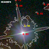 Object #190 x,y = (2050, 3475) RA, Dec = (02:27:08.952, 49:01:27.84) = (36.78730, 49.02440) BPZ = 2.431 [1.607--2.564] type = 10.90 (SB11_A_0_l - SB3_B10) chisq2 = 0.88 ODDS = 0.74 z_cluster = 0.702