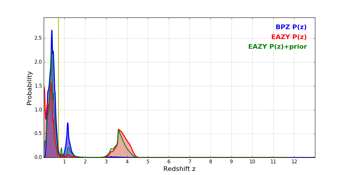 In P(z) plots: Yellow lines mark the cluster redshift z = 0.702,