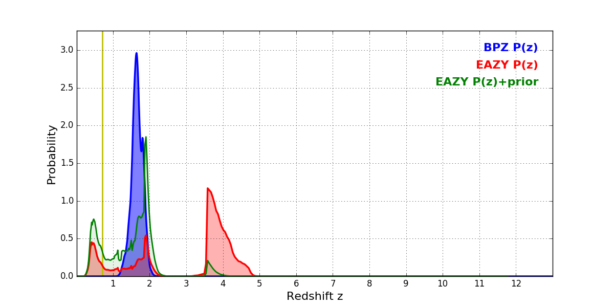 In P(z) plots: Yellow lines mark the cluster redshift z = 0.702,