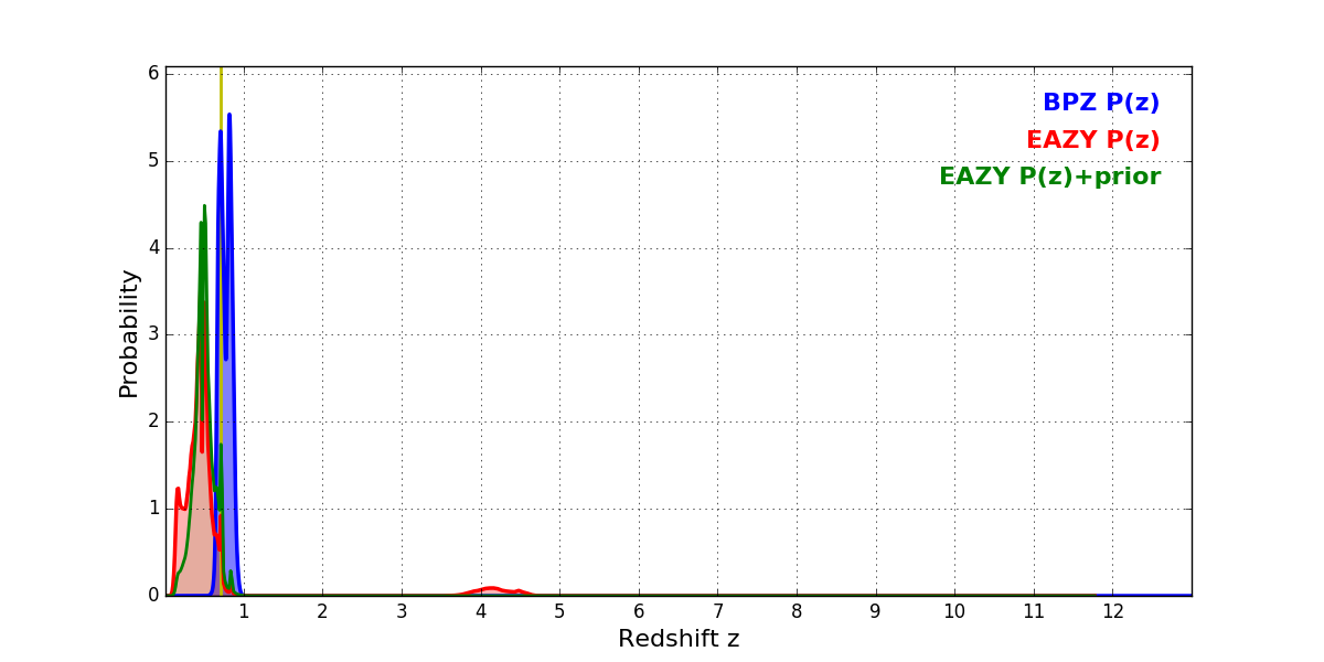 In P(z) plots: Yellow lines mark the cluster redshift z = 0.702,