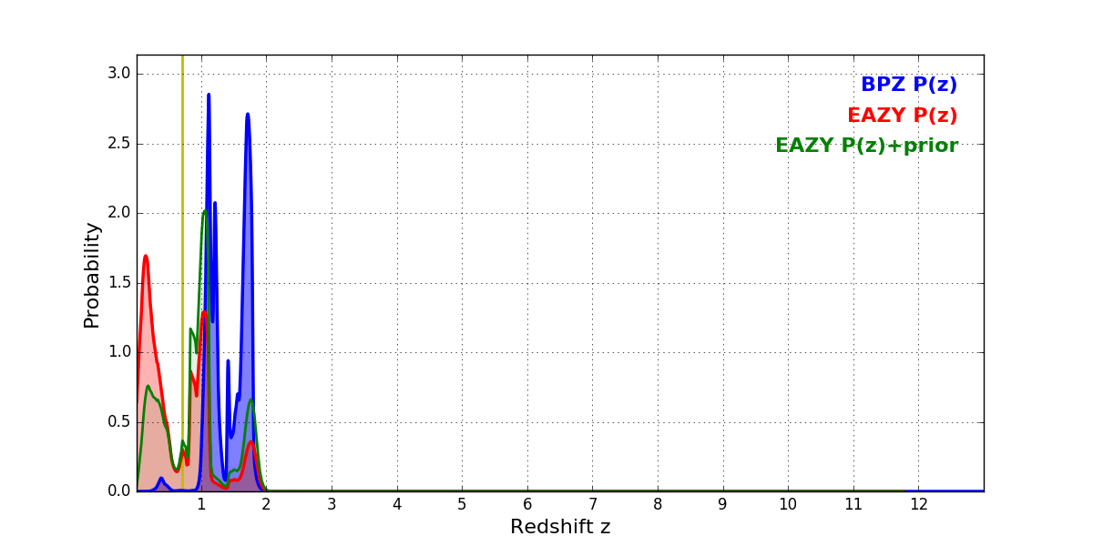 In P(z) plots: Yellow lines mark the cluster redshift z = 0.702,