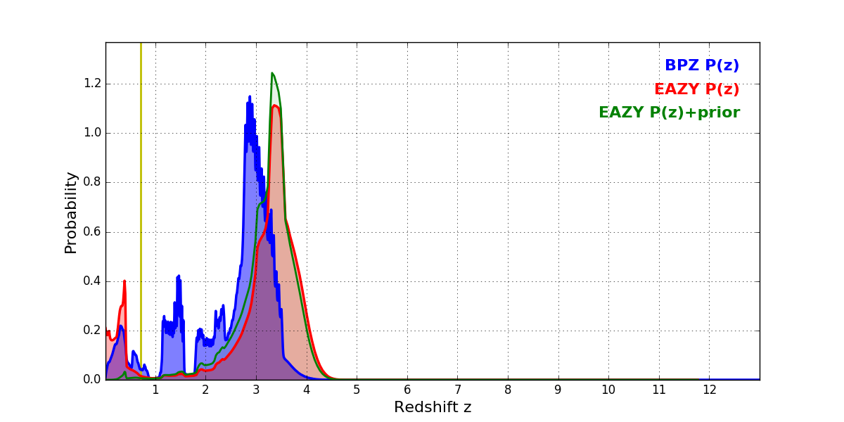 In P(z) plots: Yellow lines mark the cluster redshift z = 0.702,