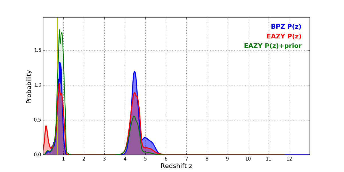 In P(z) plots: Yellow lines mark the cluster redshift z = 0.702,