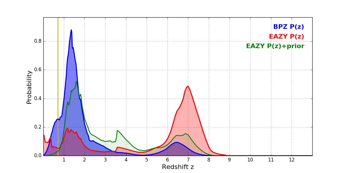 In P(z) plots: Yellow lines mark the cluster redshift z = 0.702,