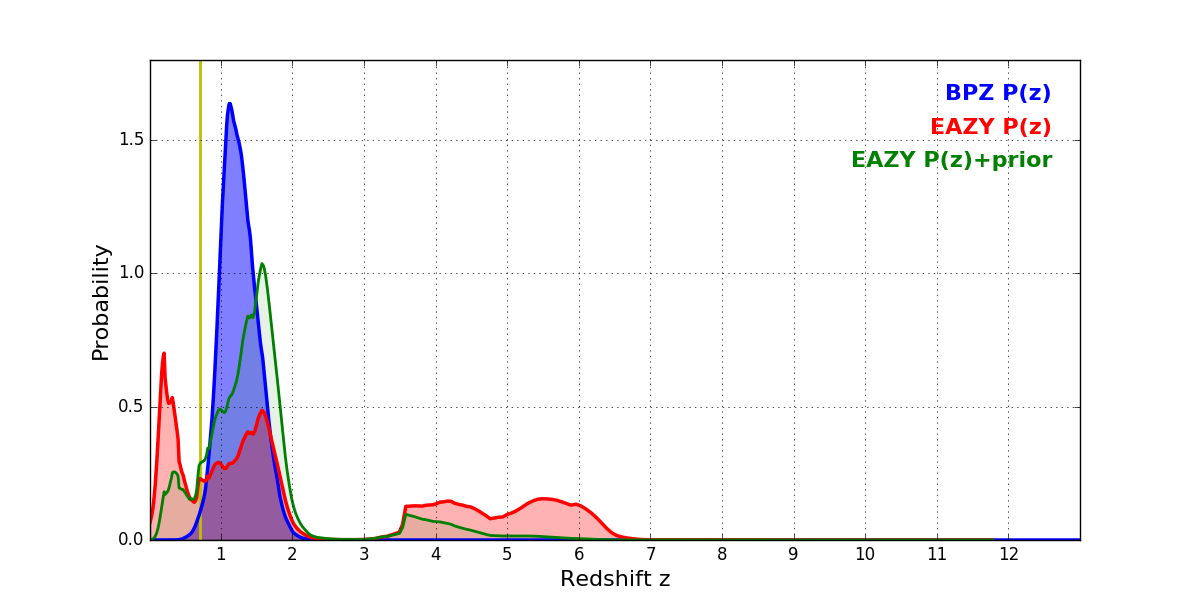 In P(z) plots: Yellow lines mark the cluster redshift z = 0.702,