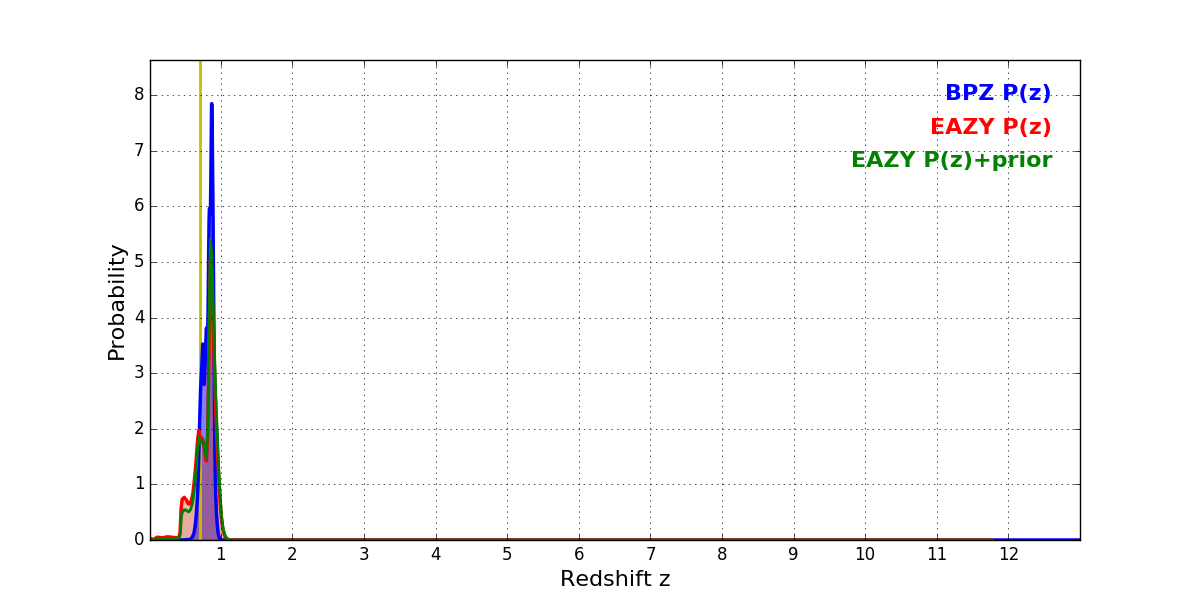In P(z) plots: Yellow lines mark the cluster redshift z = 0.702,