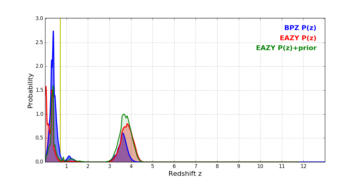 In P(z) plots: Yellow lines mark the cluster redshift z = 0.702,