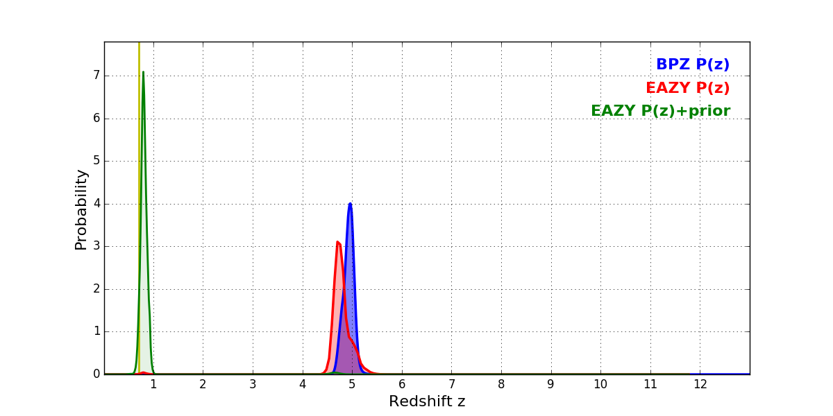 In P(z) plots: Yellow lines mark the cluster redshift z = 0.702,