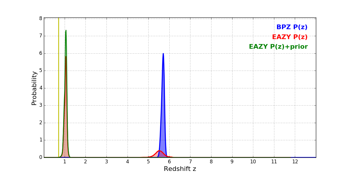 In P(z) plots: Yellow lines mark the cluster redshift z = 0.702,