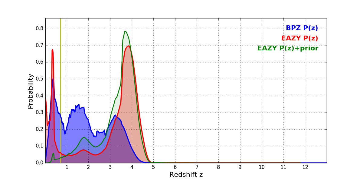 In P(z) plots: Yellow lines mark the cluster redshift z = 0.702,