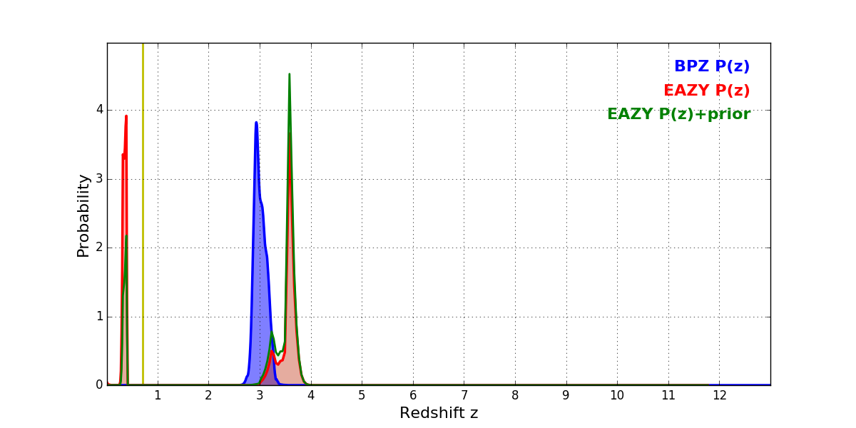 In P(z) plots: Yellow lines mark the cluster redshift z = 0.702,