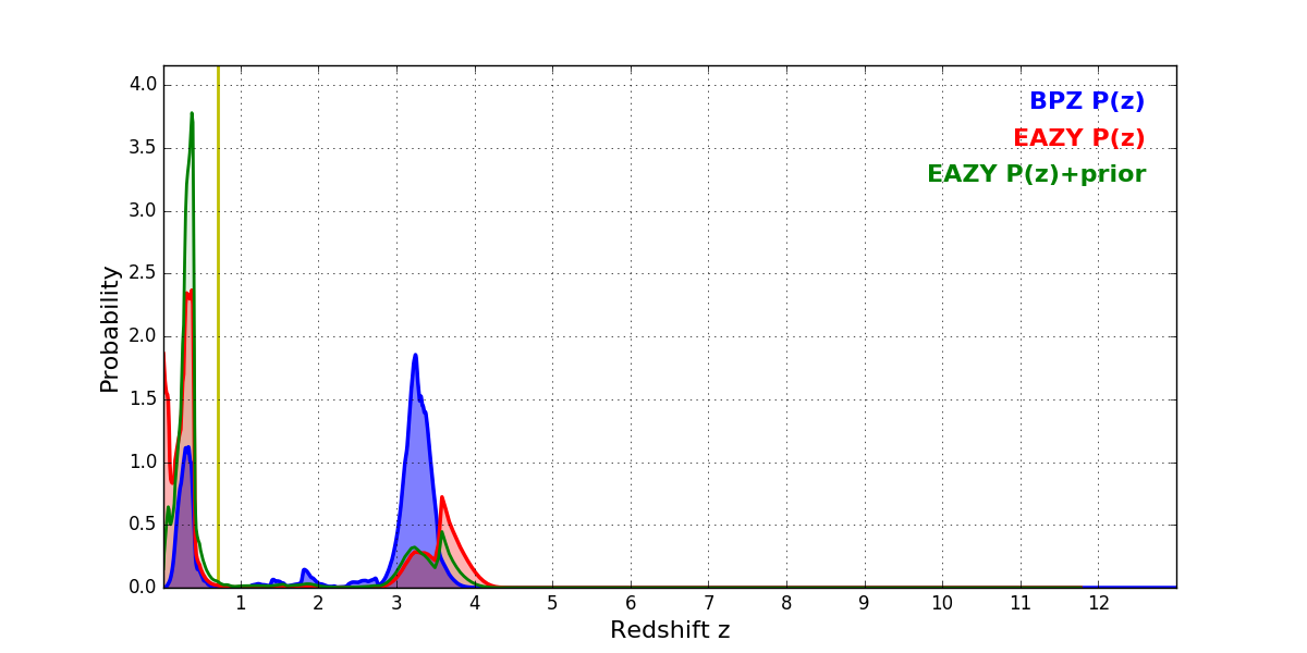 In P(z) plots: Yellow lines mark the cluster redshift z = 0.702,