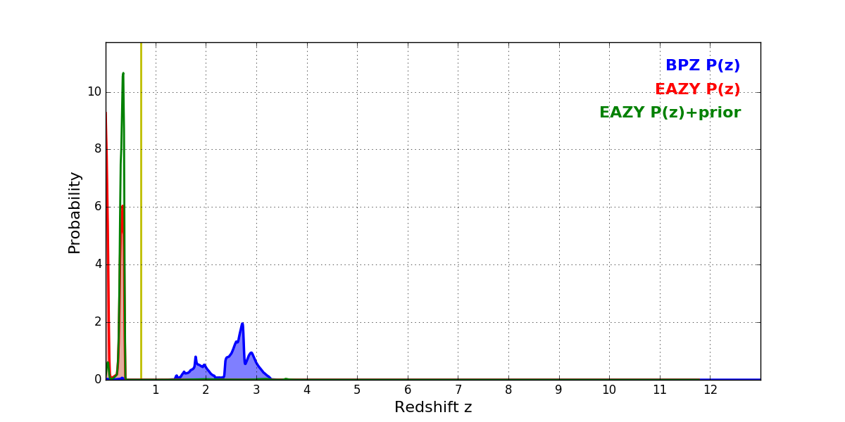 In P(z) plots: Yellow lines mark the cluster redshift z = 0.702,