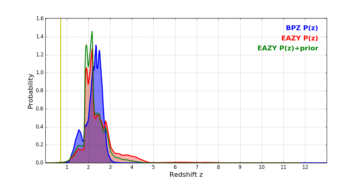 In P(z) plots: Yellow lines mark the cluster redshift z = 0.702,
