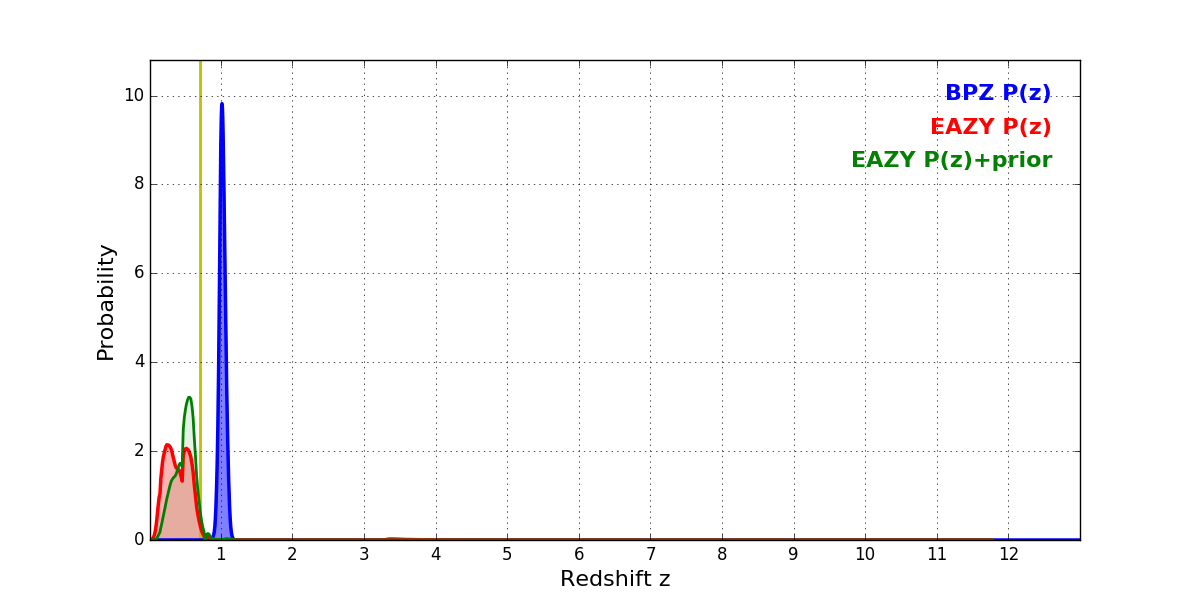 In P(z) plots: Yellow lines mark the cluster redshift z = 0.702,