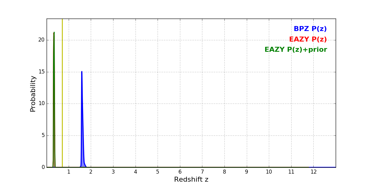 In P(z) plots: Yellow lines mark the cluster redshift z = 0.702,