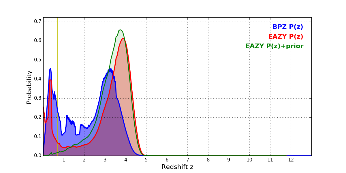 In P(z) plots: Yellow lines mark the cluster redshift z = 0.702,