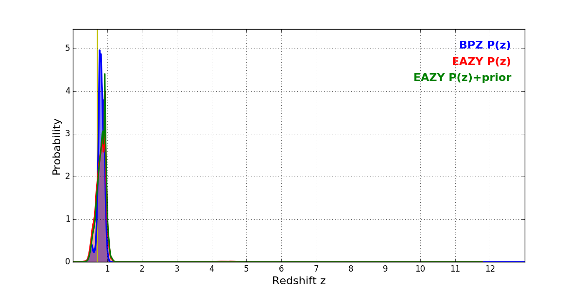 In P(z) plots: Yellow lines mark the cluster redshift z = 0.702,