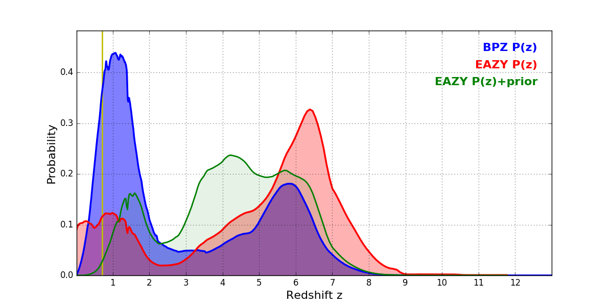In P(z) plots: Yellow lines mark the cluster redshift z = 0.702,