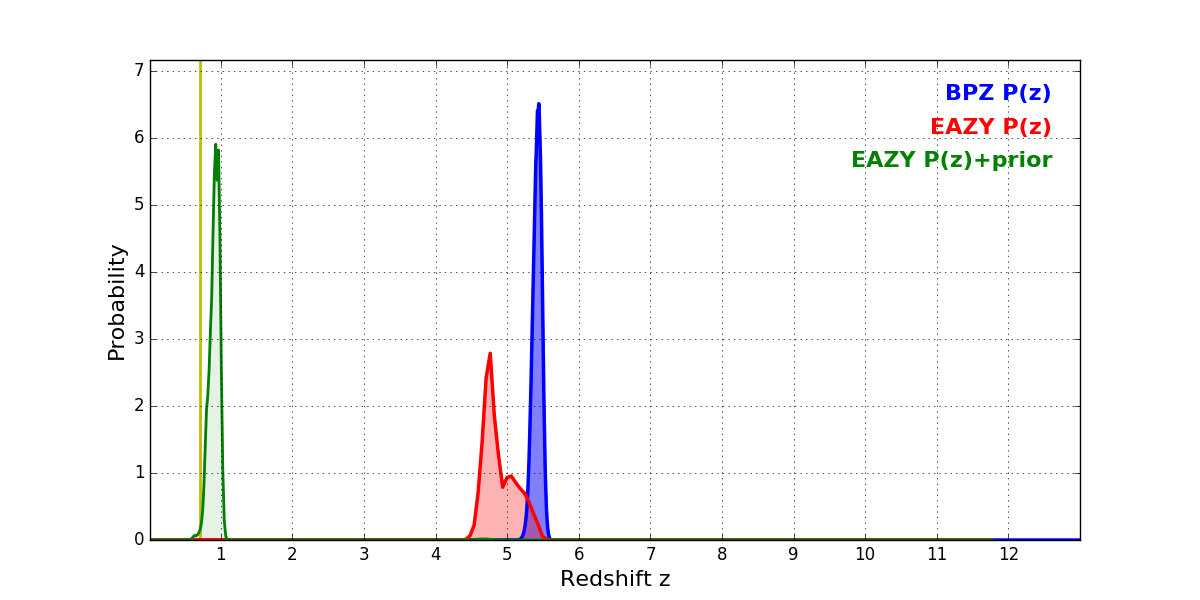 In P(z) plots: Yellow lines mark the cluster redshift z = 0.702,