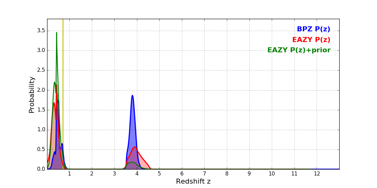 In P(z) plots: Yellow lines mark the cluster redshift z = 0.702,