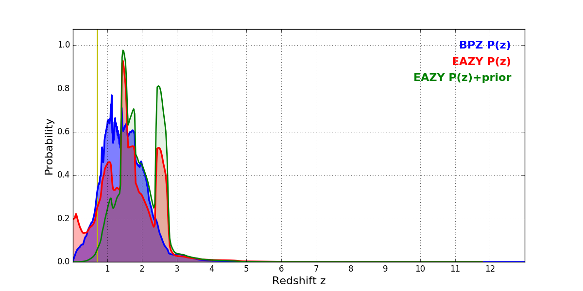 In P(z) plots: Yellow lines mark the cluster redshift z = 0.702,