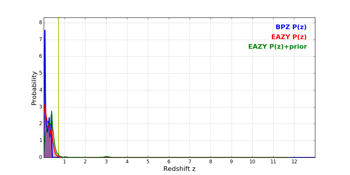 In P(z) plots: Yellow lines mark the cluster redshift z = 0.702,