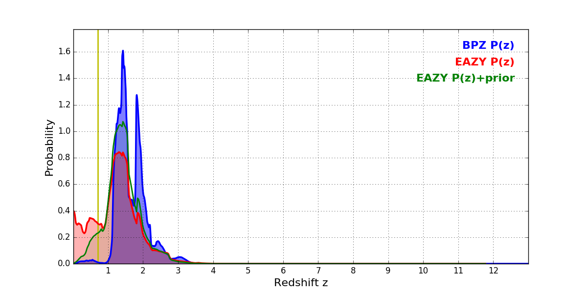 In P(z) plots: Yellow lines mark the cluster redshift z = 0.702,