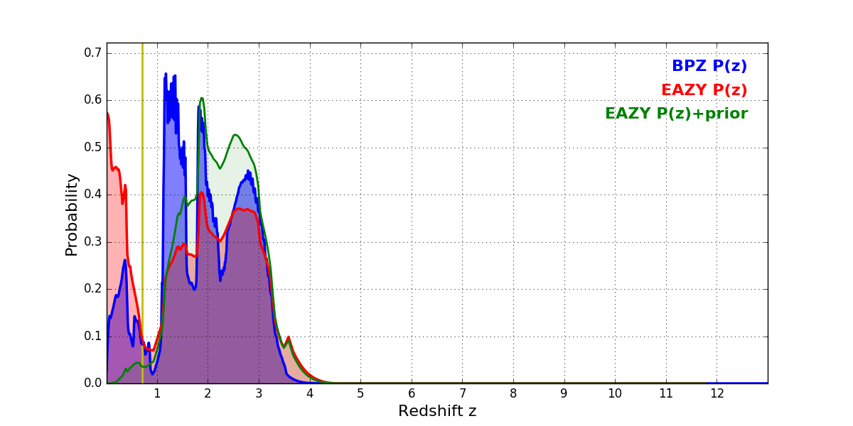 In P(z) plots: Yellow lines mark the cluster redshift z = 0.702,