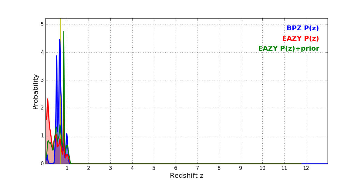 In P(z) plots: Yellow lines mark the cluster redshift z = 0.702,