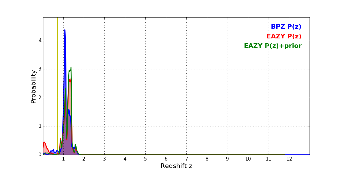 In P(z) plots: Yellow lines mark the cluster redshift z = 0.702,