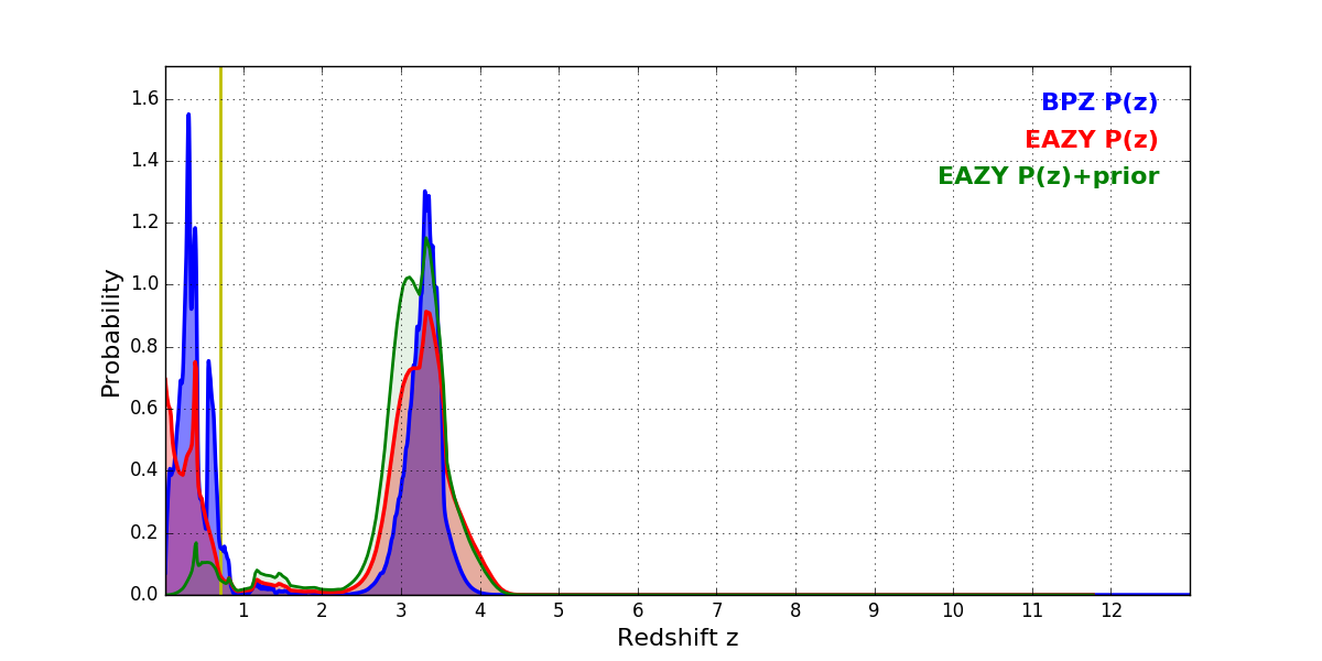 In P(z) plots: Yellow lines mark the cluster redshift z = 0.702,