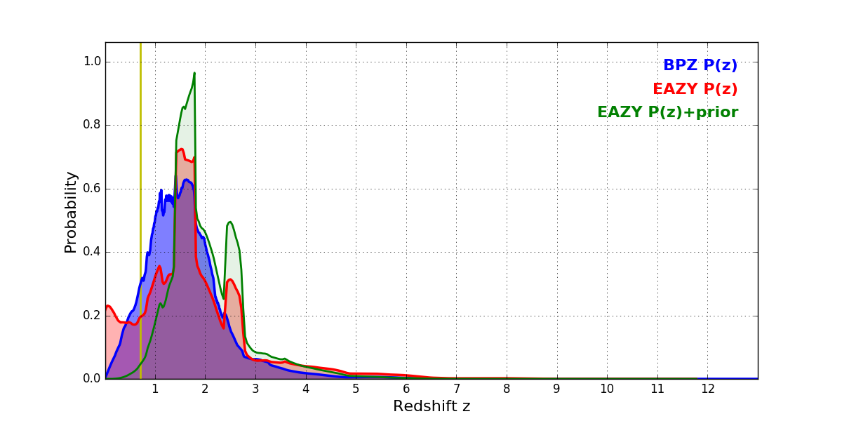 In P(z) plots: Yellow lines mark the cluster redshift z = 0.702,