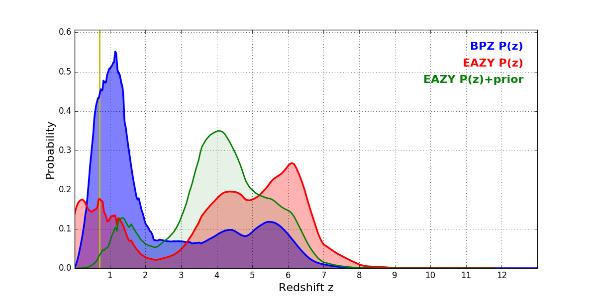 In P(z) plots: Yellow lines mark the cluster redshift z = 0.702,