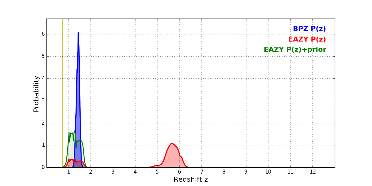 In P(z) plots: Yellow lines mark the cluster redshift z = 0.702,
