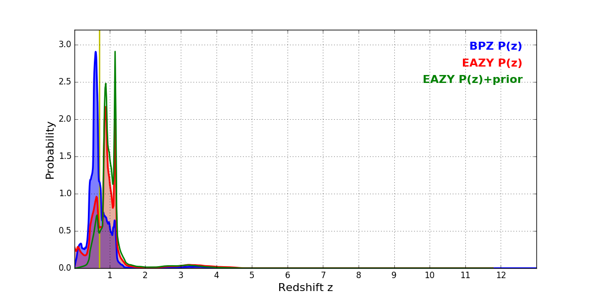 In P(z) plots: Yellow lines mark the cluster redshift z = 0.702,