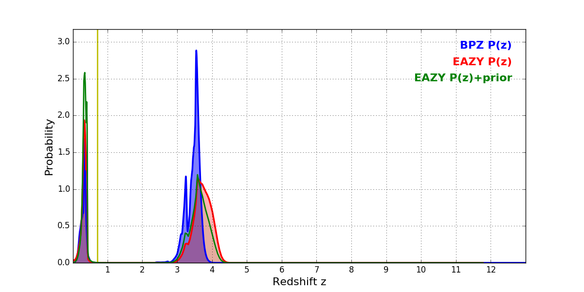 In P(z) plots: Yellow lines mark the cluster redshift z = 0.702,