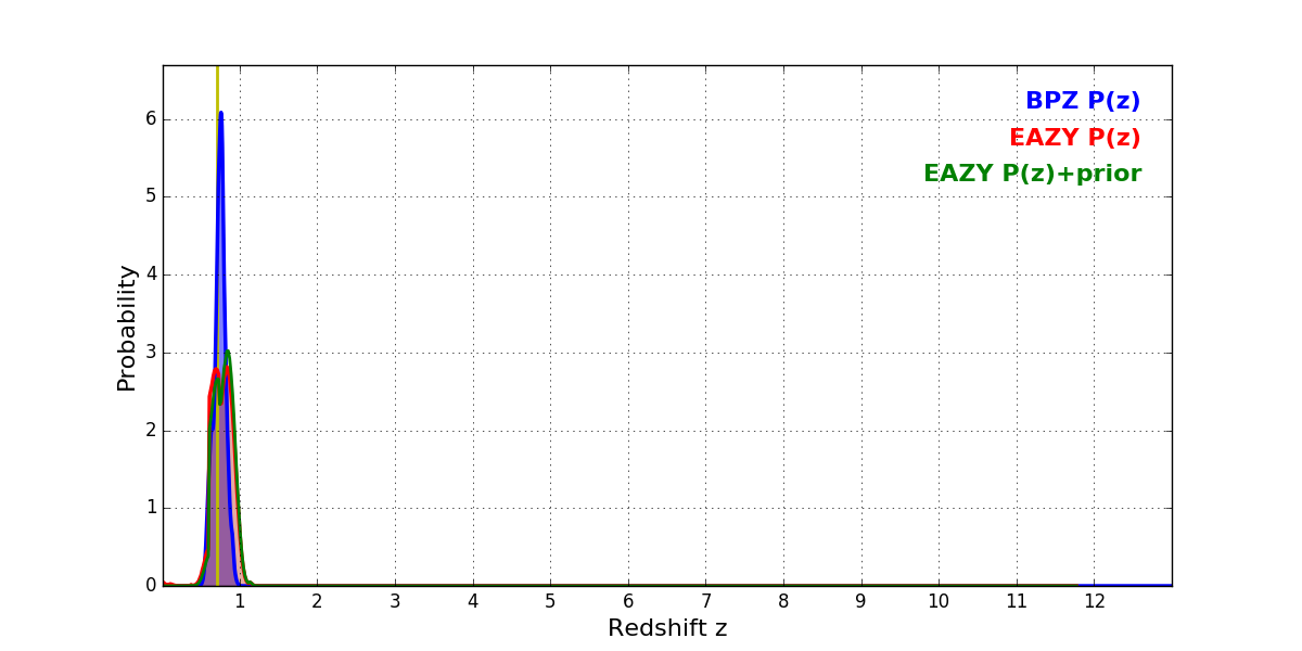 In P(z) plots: Yellow lines mark the cluster redshift z = 0.702,