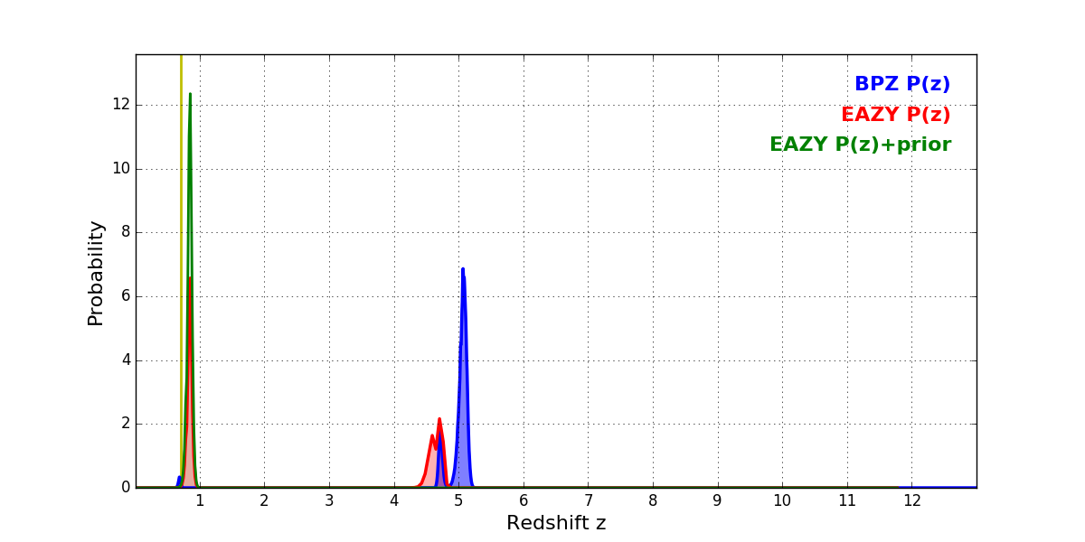 In P(z) plots: Yellow lines mark the cluster redshift z = 0.702,