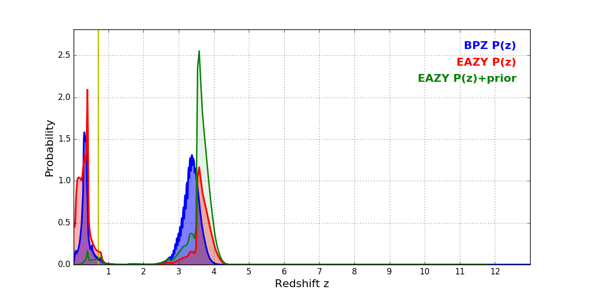 In P(z) plots: Yellow lines mark the cluster redshift z = 0.702,