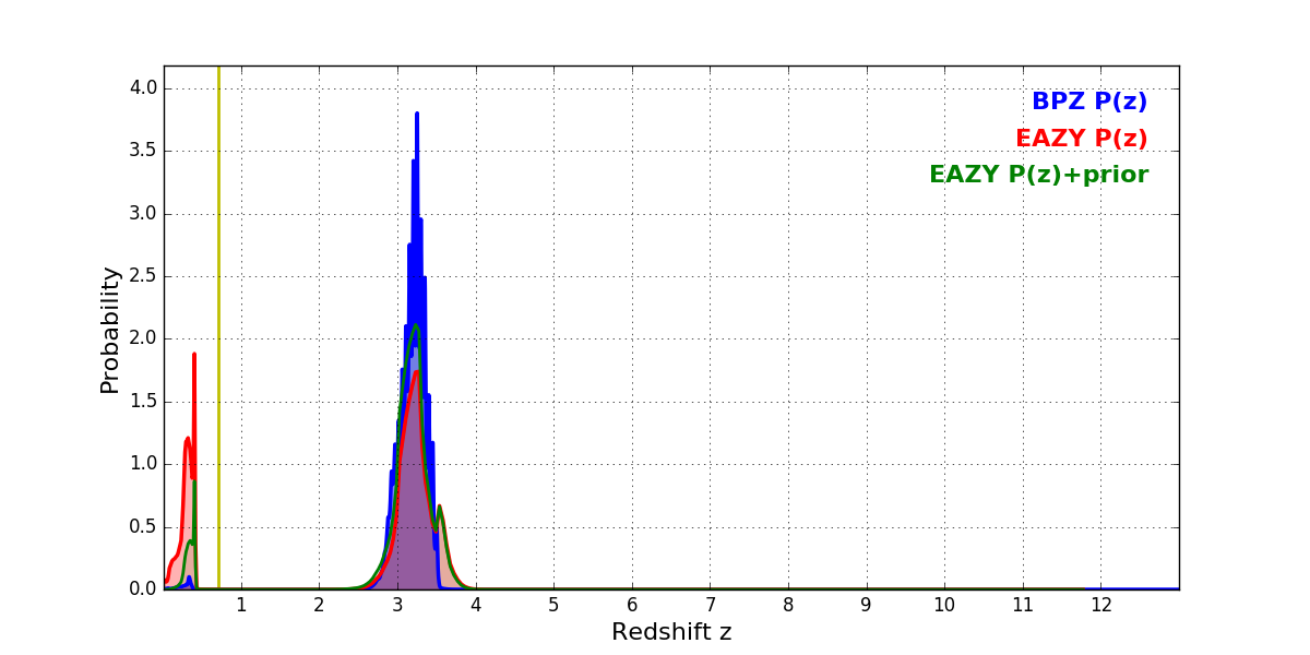 In P(z) plots: Yellow lines mark the cluster redshift z = 0.702,