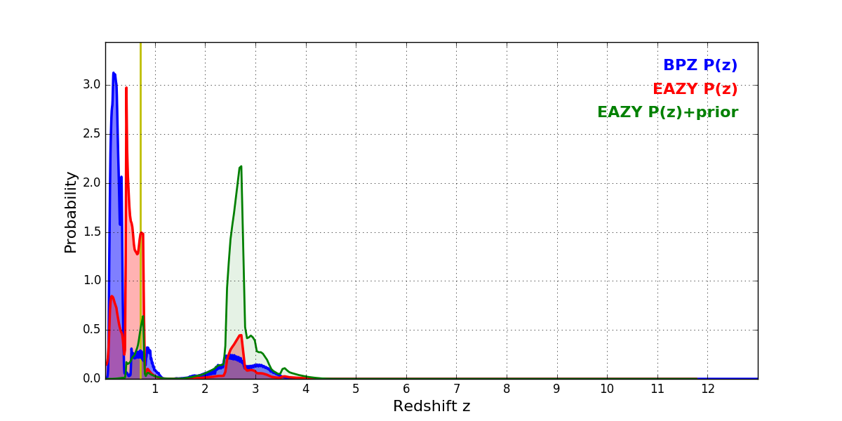 In P(z) plots: Yellow lines mark the cluster redshift z = 0.702,