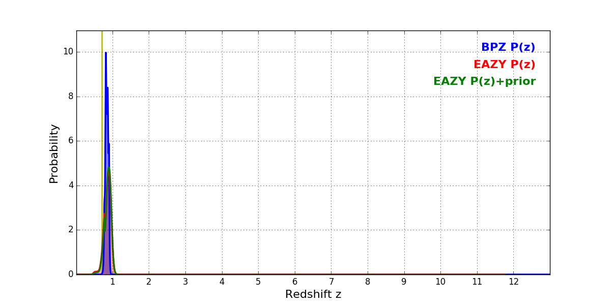 In P(z) plots: Yellow lines mark the cluster redshift z = 0.702,