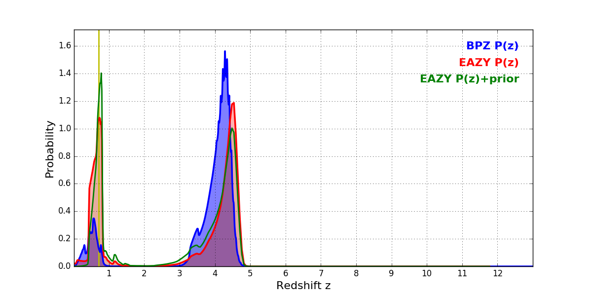In P(z) plots: Yellow lines mark the cluster redshift z = 0.702,